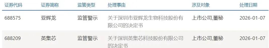 1月7日,亚辉龙及有关责任人、英集芯及有关责任人,均被上交所予以监管警示。