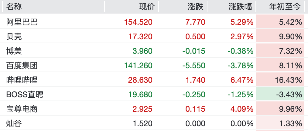 中概股多数上涨,纳斯达克中国金龙指数涨1.09%。世纪互联涨近11%,万国数据、有道涨逾7%,哔哩哔哩涨超6%,腾讯音乐、阿里巴巴涨逾5%。