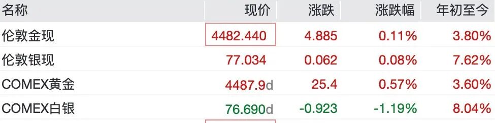 黄金、白银夜盘走势分化,现货黄金小幅收涨,逼近4490美元关口,现货白银持续下挫跌超1.6%,截至北京时间7:00,现货白银由跌转涨重上77美元/盎司上方。