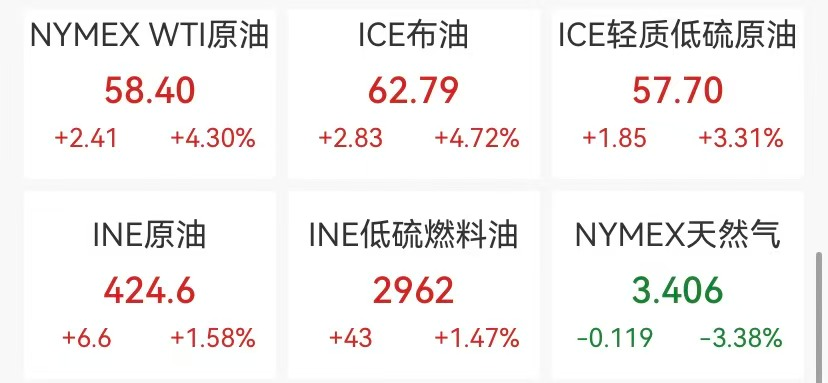 国际油价同步大涨,NYMEX WTI原油、ICE布油均涨4%,分别报58.4美元/桶、62.79美元/桶。
