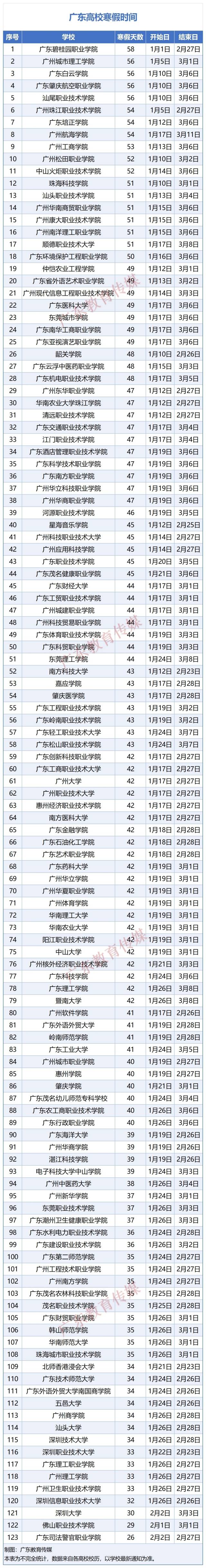 全省123所高校寒假时间排行榜