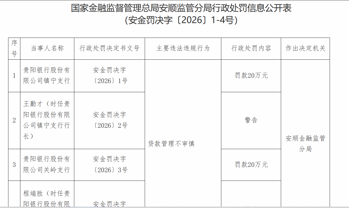 1月8日,国家金融监督管理总局安顺监管分局行政处罚信息公开表显示,因贷款管理不审慎,贵阳银行股份有限公司旗下两家支行同时被罚,镇宁支行被罚款20万元,关岭支行被罚款20万元,相关责任人被警告。