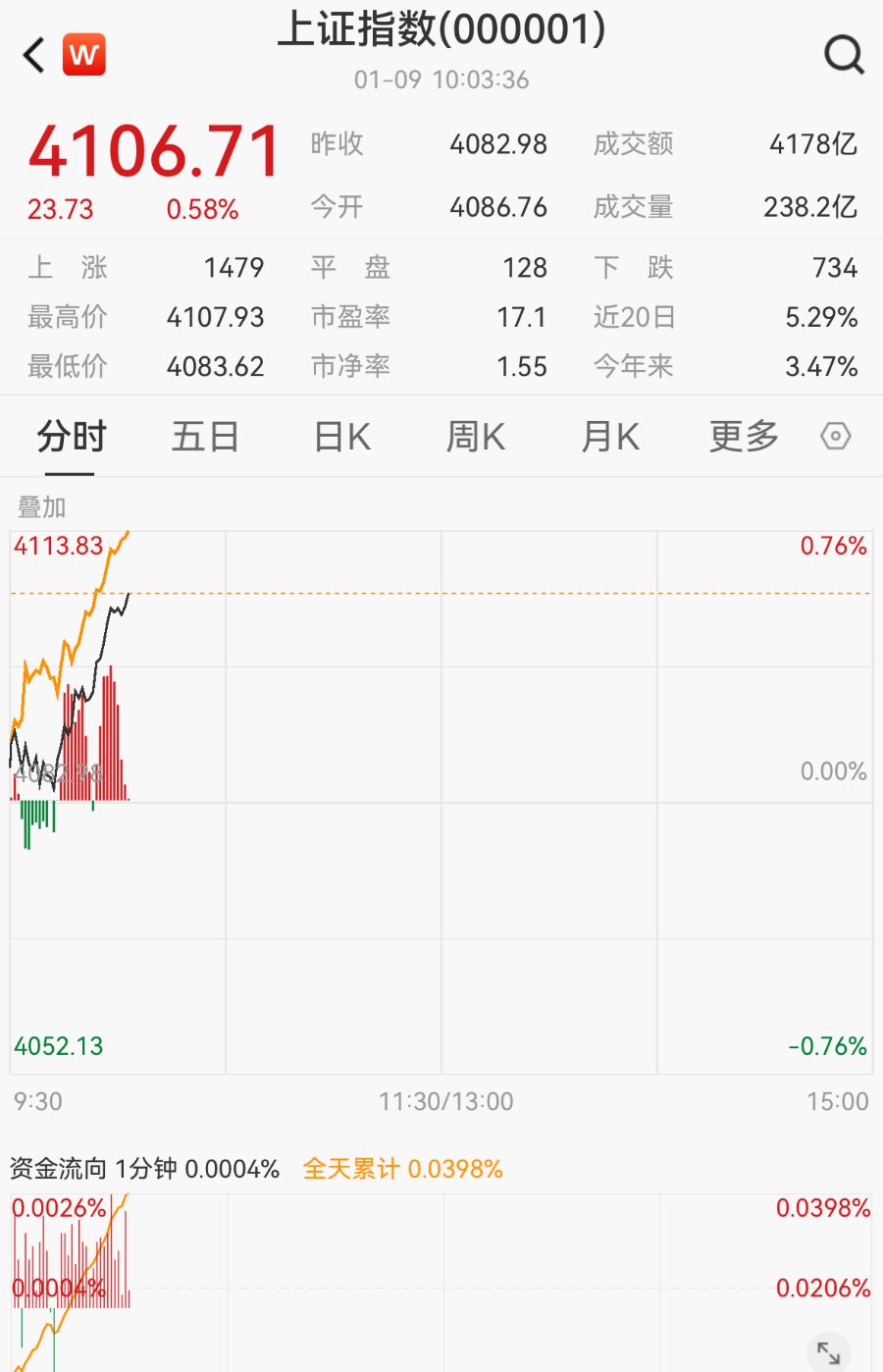 1月9日早盘,A股三大指数走强,其中沪指时隔10年再度站上4100点,截至10:03,报4106.71点,涨0.58%。