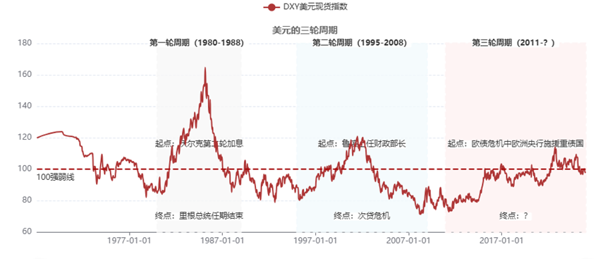 回顾过去几十年,美元指数的每一次大周期转向,基本都围绕一个核心:经济基本面。要么是美国自己经济出了问题,比如陷入滞胀;要么是别人家经济增长得更快。汇率升降,不过是给这种经济趋势的变化“打个分”而已。