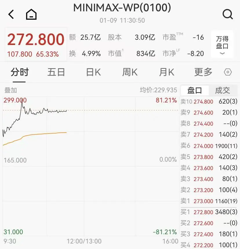 AI大模型公司MiniMax上市首日高开,盘中涨幅最高触及81%,而后回落至65%,股价报272.8港元/股,总市值834亿港元。成立仅4年的稀宇科技(MiniMax)刷新了全球AI领域从创立到上市的最快纪录。