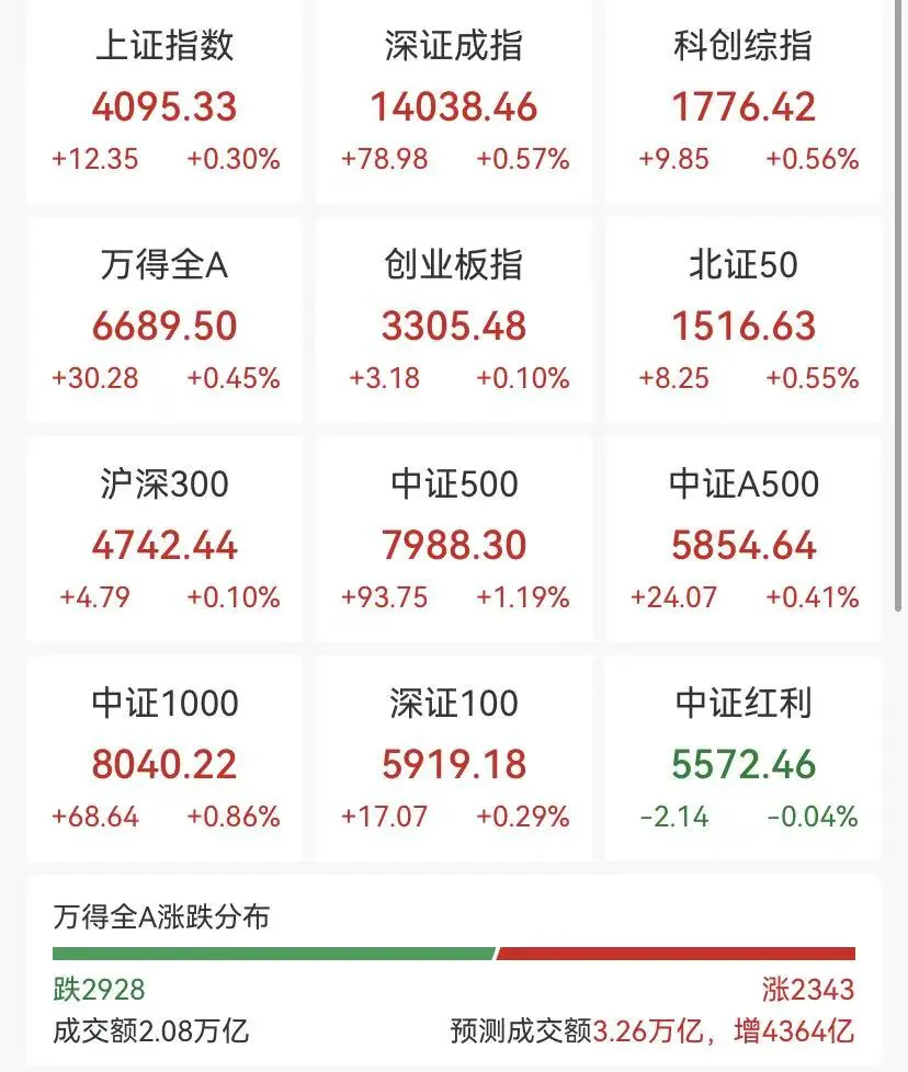 具体来看,截至午盘,沪指涨0.3%,深成指涨0.57%,创业板指涨0.1%。沪深两市半日成交额2.08万亿元,较上个交易日放量2963亿元。全市场上涨个股有2343家,下跌个股有2928家,64只股涨停。