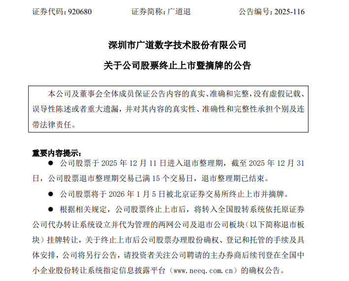 2026年1月5日晚,深圳市广道数字技术股份有限公司(下称“广道退”)发布公告,公司股票被北京证券交易所终止上市并摘牌,成为新年首家退市股票,同时也是北交所设立以来首例因重大违法被强制退市的案例。