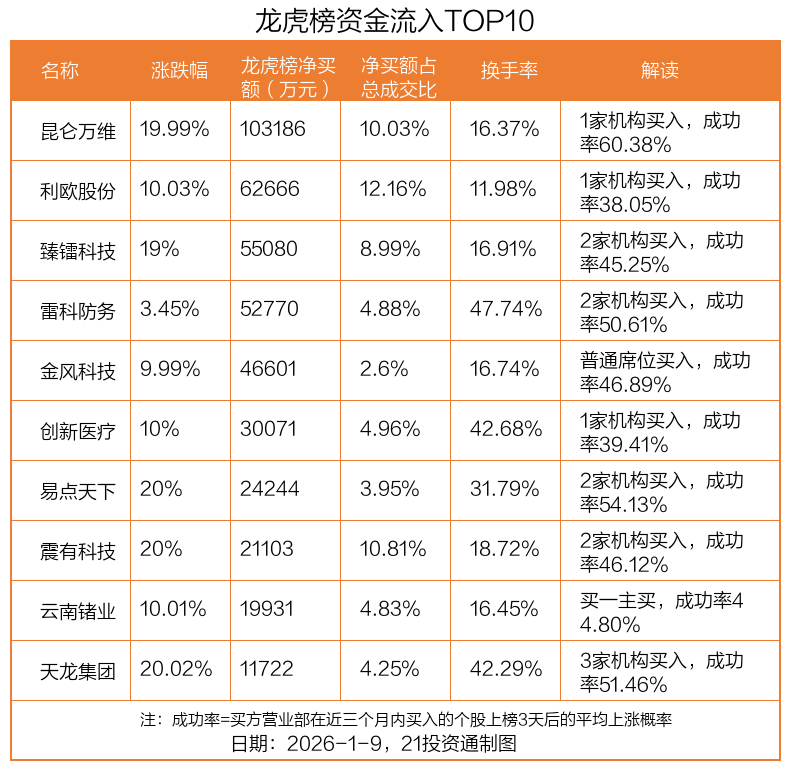 1月9日,上证指数上涨0.92%,深证成指上涨1.15%,创业板指上涨0.77%。盘后龙虎榜数据显示,共有54只个股因当日异动登上龙虎榜,资金净流入最多的是昆仑万维(300418.SZ),达10.32亿元。