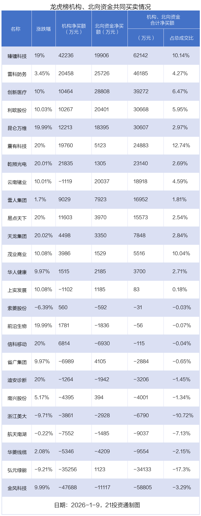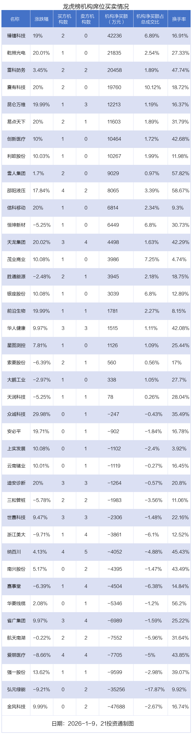 1月9日,40只个股龙虎榜出现了机构的身影,机构合计净买入5.42亿元。具体来看,机构净买入22股,净卖出18股。