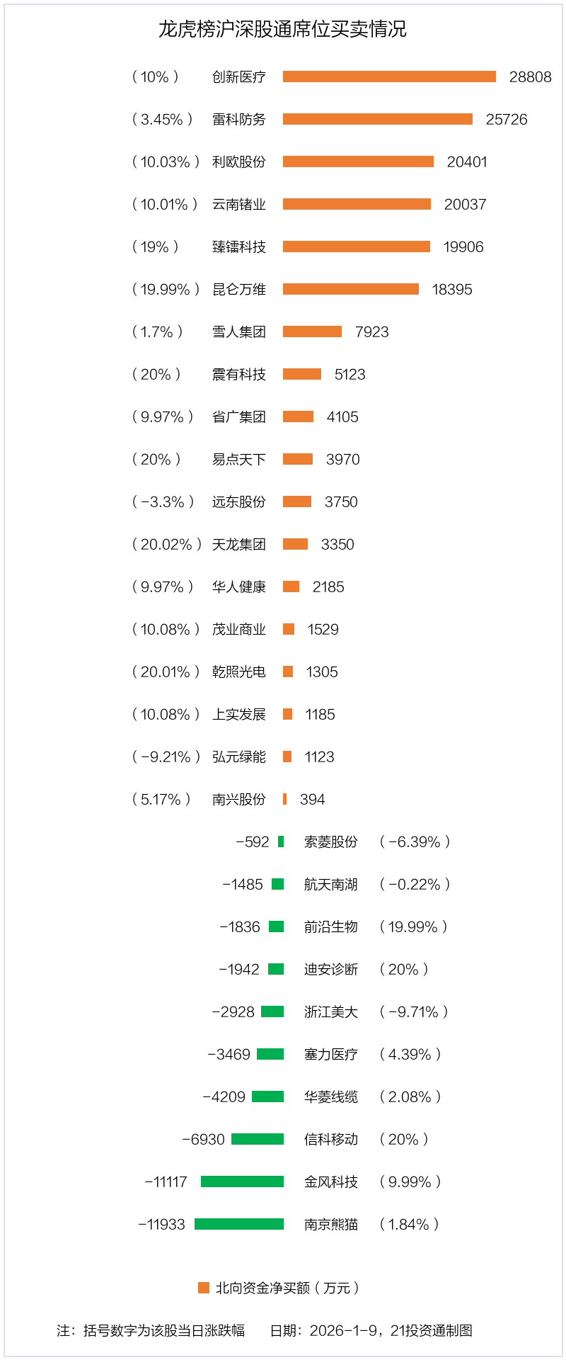 1月9日,北向资金参与龙虎榜中的个股共有28只,合计净买入12.28亿元。其中沪股通净买入6 股,净卖出5 股,合计净买入6963.73万元;深股通净买入12 股,净卖出5 股,合计净买入11.58亿元。