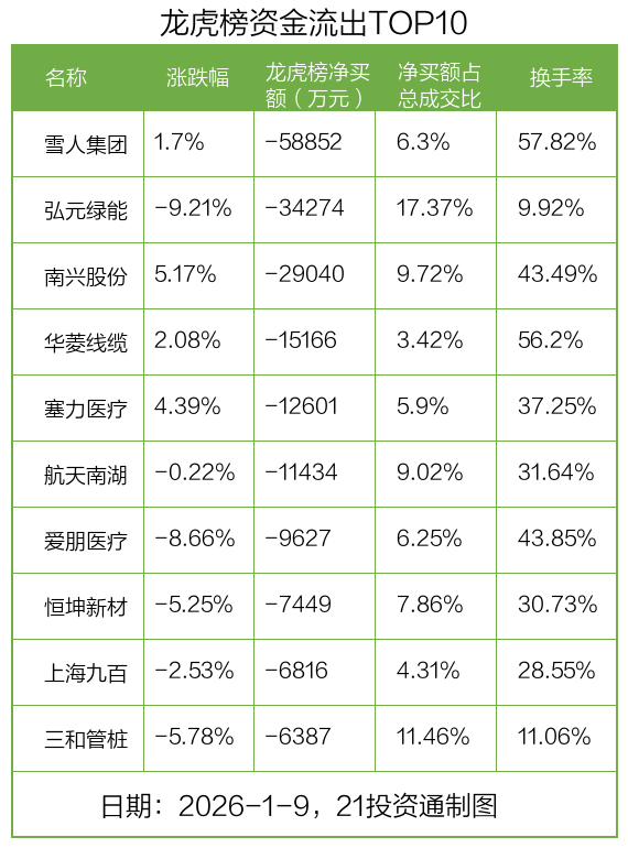 而龙虎榜中资金净流出最多的是雪人集团(002639.SZ),被净卖出为5.89亿元,占总成交金额的6.3%。雪人集团收盘上涨1.7%,换手率为57.82%。