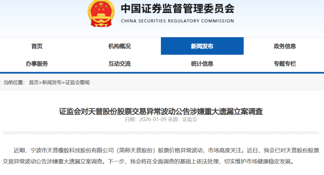 1月9日晚间,证监会发布公告称,近期,宁波市天普橡胶科技股份有限公司(简称天普股份)股票价格异常波动,市场高度关注。近日,我会已对天普股份股票交易异常波动公告涉嫌重大遗漏立案调查。下一步,我会将在全面调查的基础上依法处理,切实维护市场健康稳定发展。