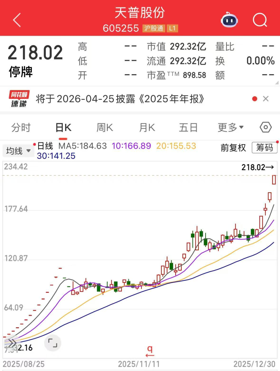 天普股份,是一家主营汽车橡胶管路的传统制造企业,自2025年8月22日至12月30日,其股价便一路上扬,截至12月31日停牌前,股价已经涨至218.02元/股,从8月22日市值不足40亿元直线飙升至292.32亿元,累计上涨718.39%,2025年全年公司股价上涨1663.2%,成为年度涨幅榜上的“第二大牛股”。