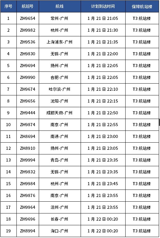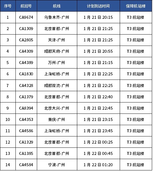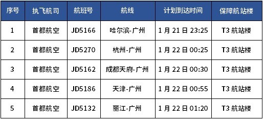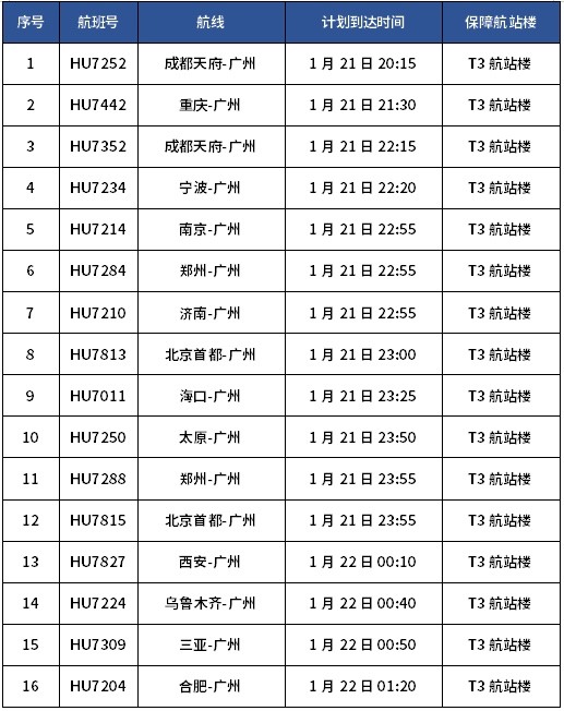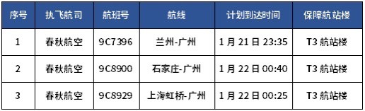特别留意的是:部分计划到达时间在1月22日02:00前的国内进港航班将提前调整至T3航站楼保障,具体航班列表如下。