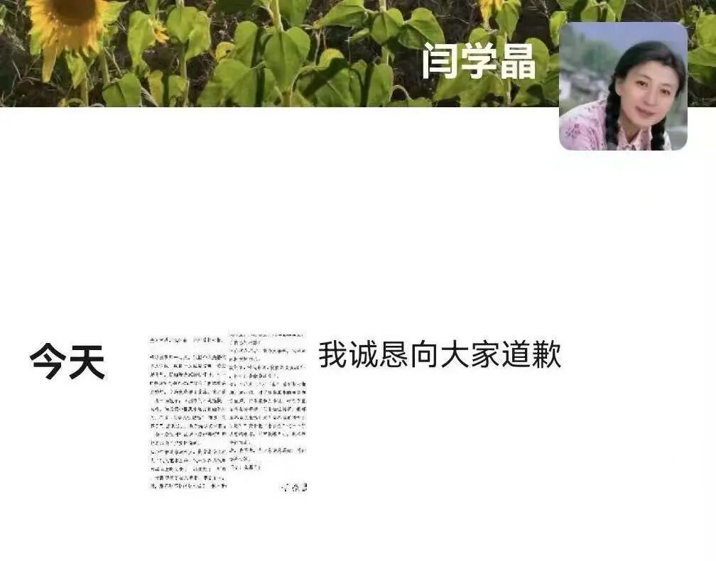 1月11日晚,闫学晶在朋友圈发文致歉,记者从相关渠道获悉,这确实是闫学晶朋友圈所发。