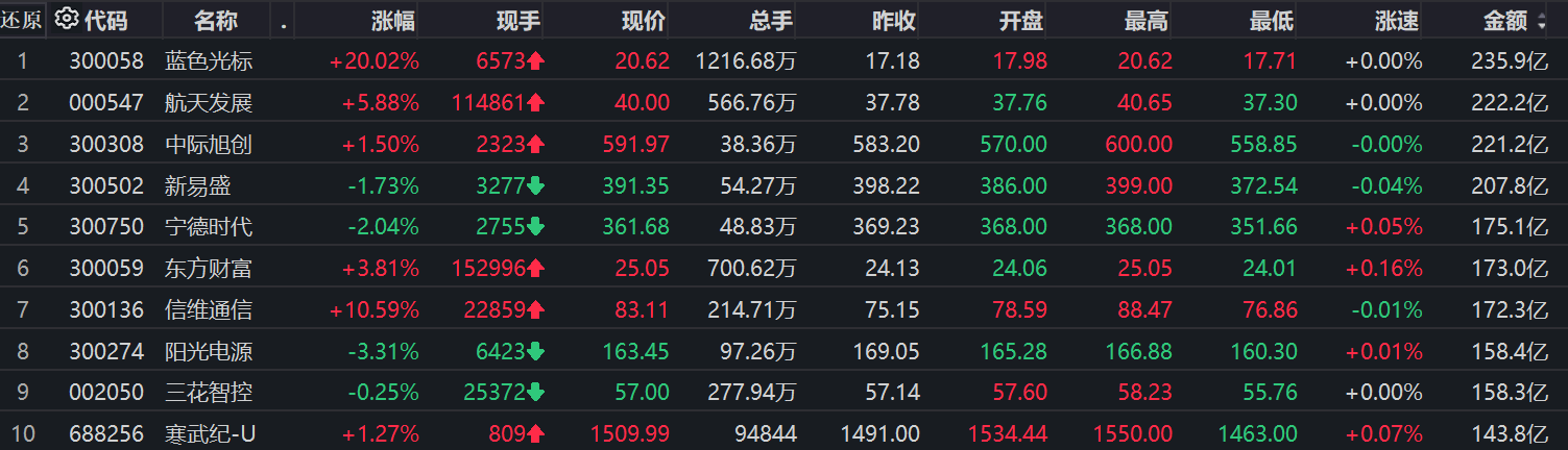 个股方面,蓝色光标235.9亿元成交额居首,航天发展、中际旭创、新易盛成交额靠前。