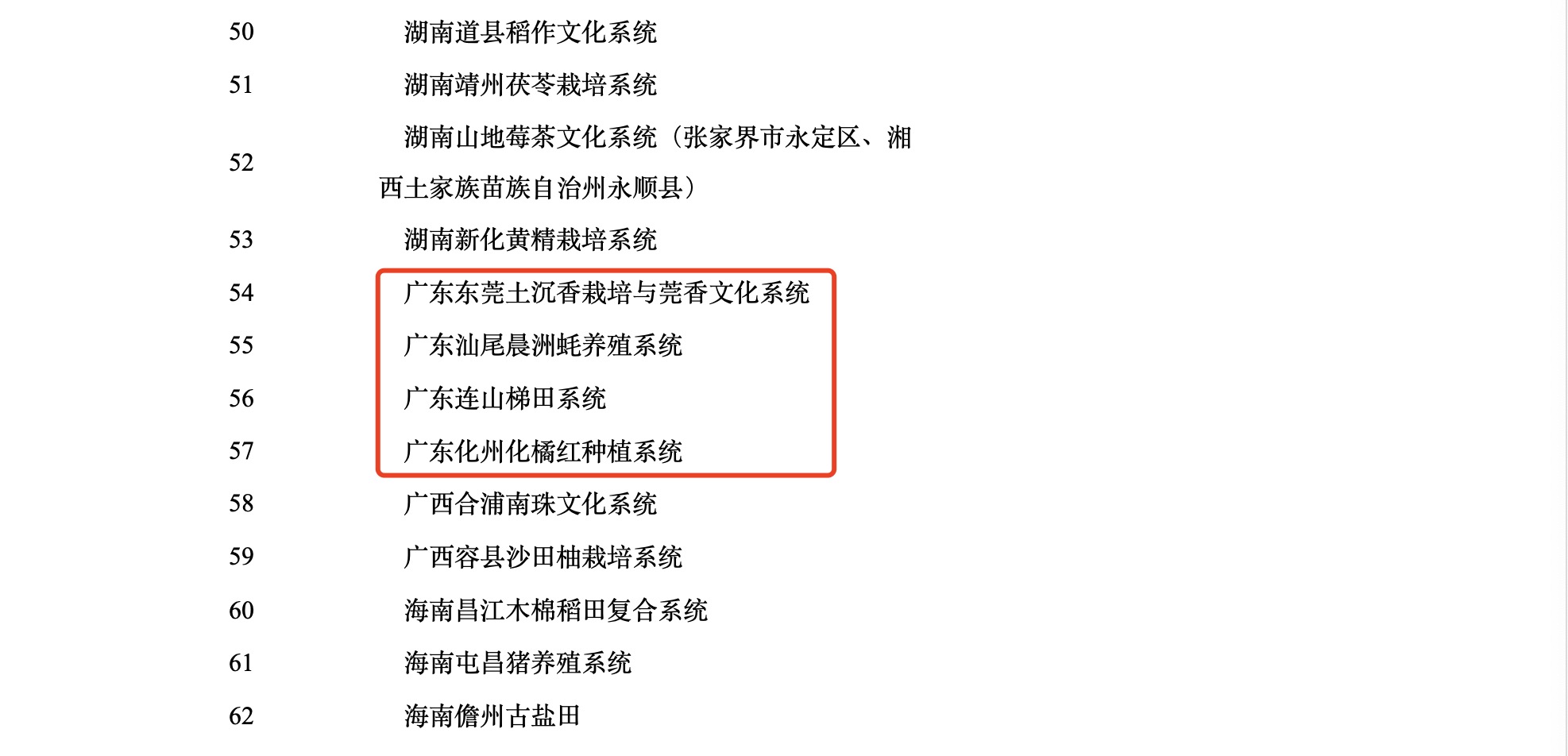 在本次入围的90个候选项目中,广东地区有四处入选,即东莞土沉香栽培与莞香文化系统、汕尾晨洲蚝养殖系统、连山梯田系统、化州化橘红种植系统4个项目。