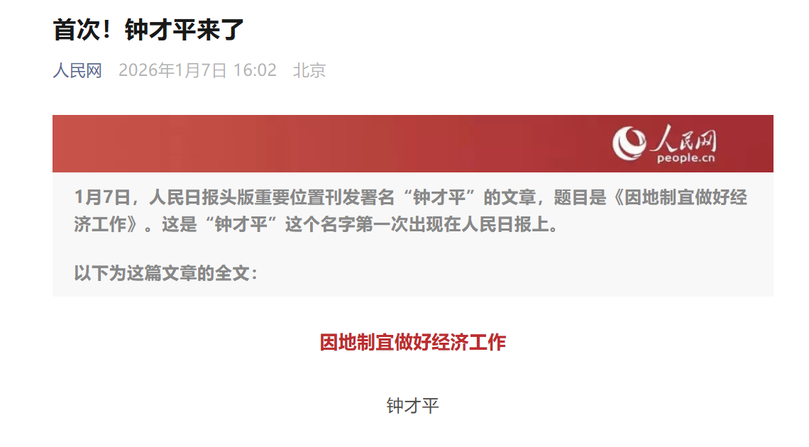 1月7日,人民日报头版重要位置刊发署名“钟才平”的文章。截至1月12日已刊发6篇,主题分别是“因地制宜做好经济工作”“向新向优发展,中国经济向好”“发挥政策集成效应,提升宏观经济治理效能”“统筹促消费和扩投资,建设强大国内市场”“以惠民生为牵引,打开发展新空间”“持续扩大开放,为世界提供新机遇”。这些文章涉及经济工作的重要原则和重点领域。