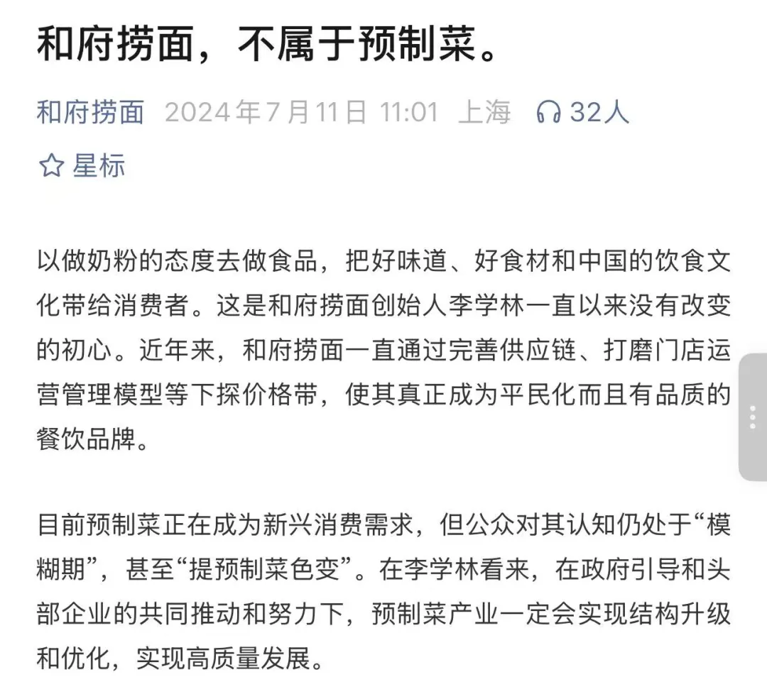 实际多年前,和府捞面就曾陷入“预制”质疑。2022年11月,和府还曾申请“一种冷冻面条的制备方法”发明专利,该专利申请后续被驳回。2024年7月,和府捞面官方公众号转发媒体报道《和府捞面,不属于预制菜》回应公众质疑,其中提到:和府捞面的餐品由中央厨房统一制作、配送,不属于预制菜,而市场大部分品牌则多为第三方预制供给。和府的中央厨房是全国最大中央厨房之一,首期投入合计5000余万。