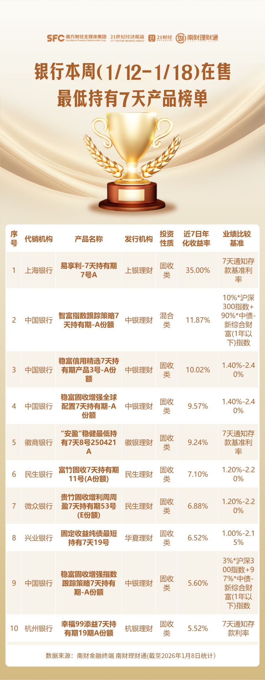 本期,南财理财通重点关注最低持有期人民币公募产品的业绩表现,按照7天、14天、30天、60天持有期限分类对产品业绩进行排名,业绩指标采用年化收益率,计算区间与持有期限相同,如60天持有期产品的业绩计算区间为近两月年化收益率,同机构同系列同投资周期产品保留一只参与排名。