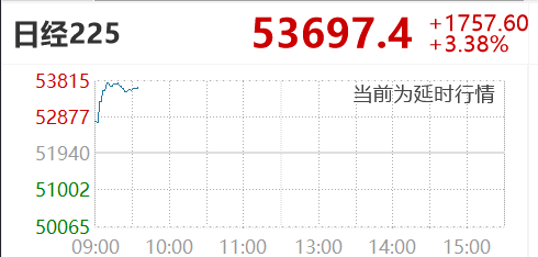 1月13日,日经225指数大幅上涨逾3%,一度涨超1800点,逼近54000关口,创下历史新高。汽车、金融和机械类股领涨,丰田汽车上涨5.0%,野村控股上涨5.2%,川崎重工上涨6.0%,日股AI及半导体概念股集体大涨,爱德万测试涨超9%,东京电子上涨7.8%,软银集团股价涨幅达5.9%。