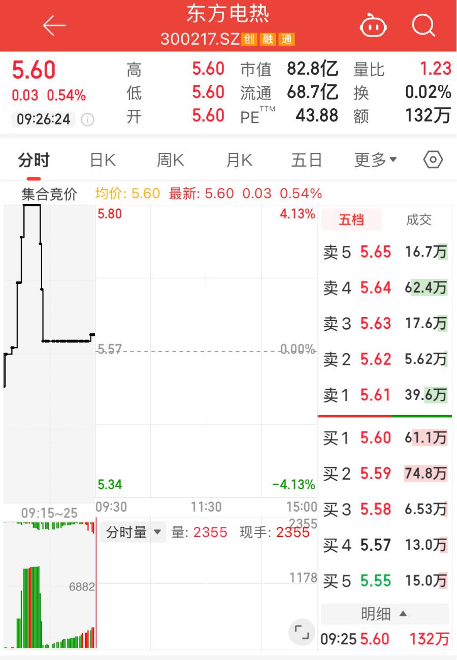 1月13日开盘,东方电热报5.6元/股,涨幅为0.54%,总市值82.8亿元。