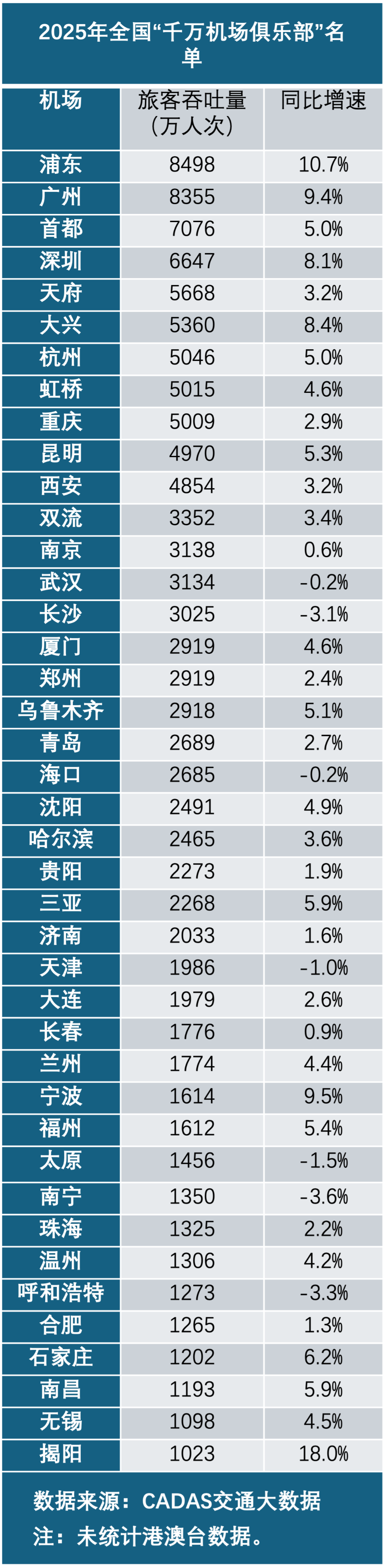 从单体机场看,2025年,上海浦东、广州白云、北京首都三座枢纽机场旅客吞吐量仍高居全国前三,分别达到8498万人次、8355万人次和7076万人次。与此同时,揭阳潮汕国际机场凭借18.0%的超高增速,实现全年旅客吞吐量1023万人次,跻身全国“千万机场俱乐部”。