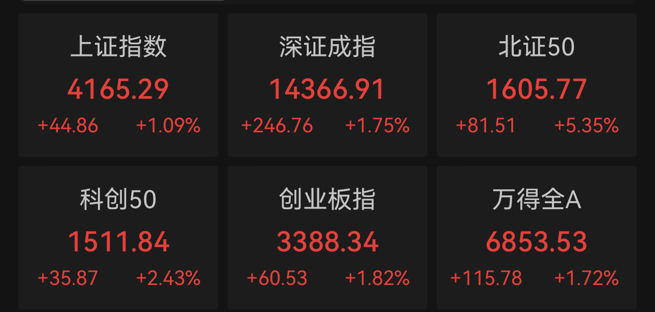 1月12日,A股市场延续强势格局。截至收盘,三大指数集体收涨,上证指数涨1.09%报4165.29点,深证成指涨1.75%报14366.91点,创业板指涨1.82%报3388.34点。全市场成交额36445亿元,创历史新高,较上日成交额放量4922亿元。