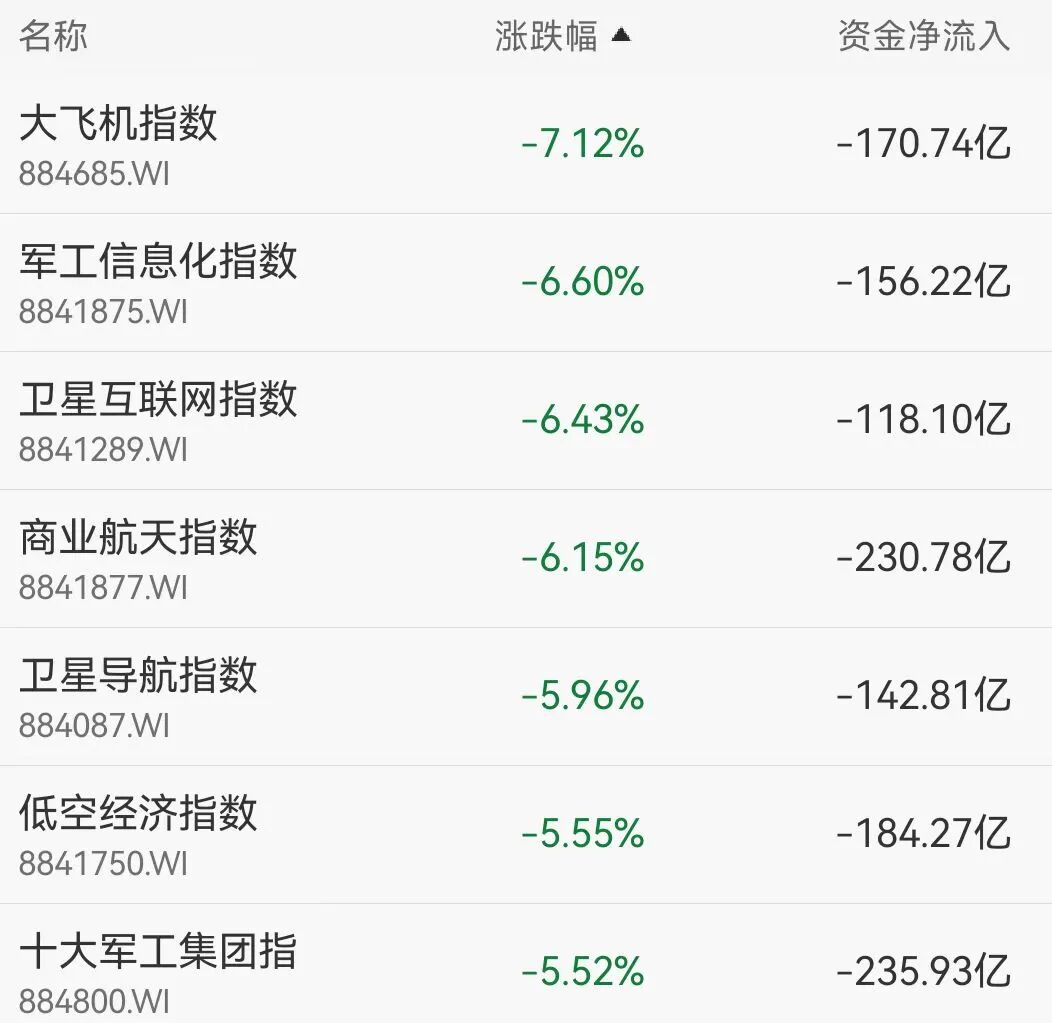 盘面上,多家公司公告提示风险,商业航天、卫星互联网板块大退潮,航天电子、中国卫通、航天科技等近百股跌超8%;大飞机、军工板块走低,中天火箭、雷科防务等多股跌停;可控核聚变板块下挫,王子新材跌停;通信设备板块走低,长江通信跌停;北斗导航、量子科技、3D打印、CPO概念及F5G概念等跌幅居前。
