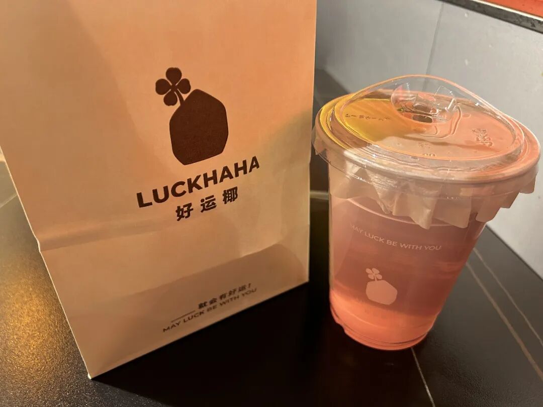 △图片来源:红餐网摄在这样的趋势下,成立于2021年的好运椰,则凭借着一杯“粉椰”出圈。由于粉色椰并不常见,据说要开100个椰子才能出现一个,好运椰就此顺势打造“喝到粉红椰即获好运”的营销概念,吸引众多年轻人打卡。据36氪,在2022年8月北京首店开出后,好运椰曾多次登上美团外卖榜单果汁热销榜(朝阳区)TOP1及美团外卖榜单果汁好评榜(北京)TOP1。