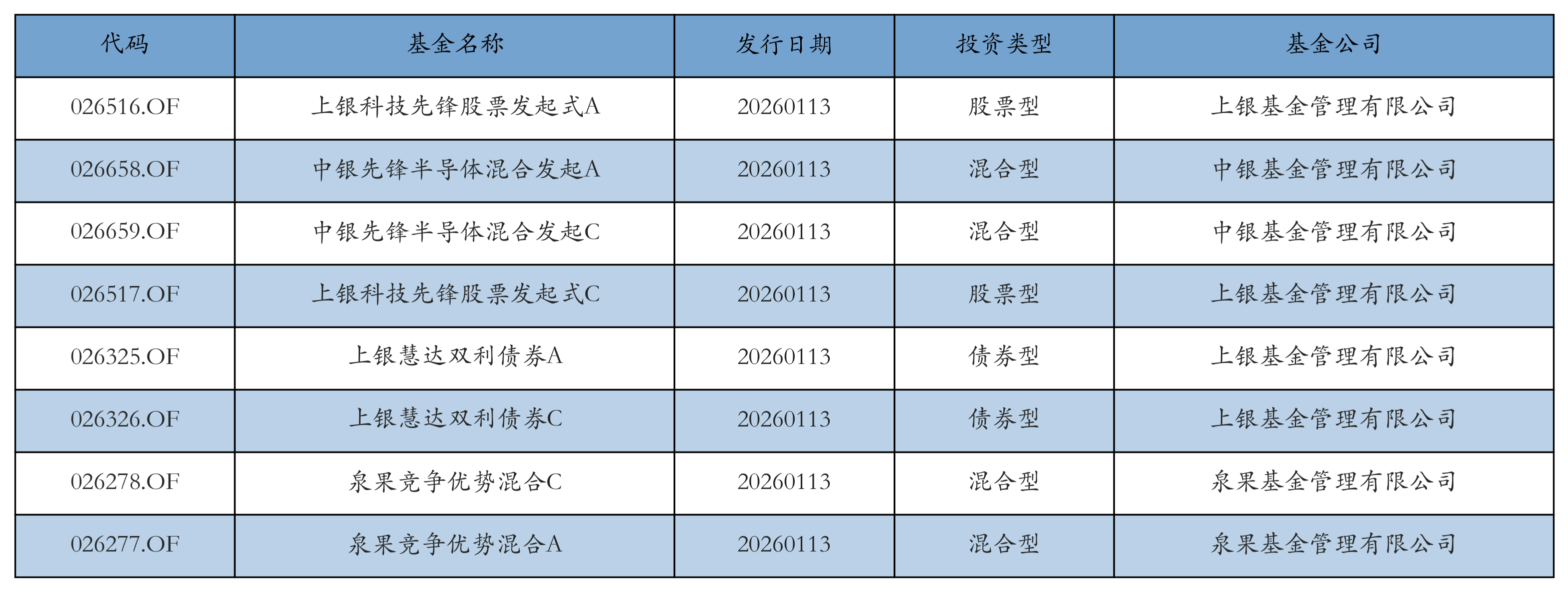 昨日有8只新基金发行,分别为:上银科技先锋股票发起式A、中银先锋半导体混合发起A、中银先锋半导体混合发起C、上银科技先锋股票发起式C、上银慧达双利债券A、上银慧达双利债券C、泉果竞争优势混合C、泉果竞争优势混合A,详情见下表: