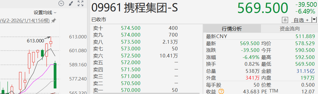受此影响,携程股价当日盘中最高跌幅超9%,截至收盘跌6.49%,报569.50港元。