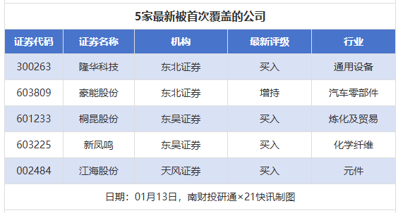 首次覆盖方面,1月13日券商共给出了5次首次覆盖,其中隆华科技、豪能股份获得东北证券分别给予“买入”“增持”评级,桐昆股份、新凤鸣均获得东吴证券给予“买入”评级,江海股份获得天风证券给予“买入”评级。