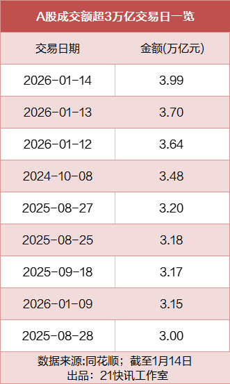 1月14日,A股市场再度迎来历史性一刻,全市场成交额达3.99万亿元,逼近4万亿关口,刷新1月13日3.7万亿元的纪录,再度改写A股成交历史极值。这也是1月9日成交额突破3万亿元后,市场连续4个交易日维持3万亿以上规模,打破此前高成交零星出现的格局。