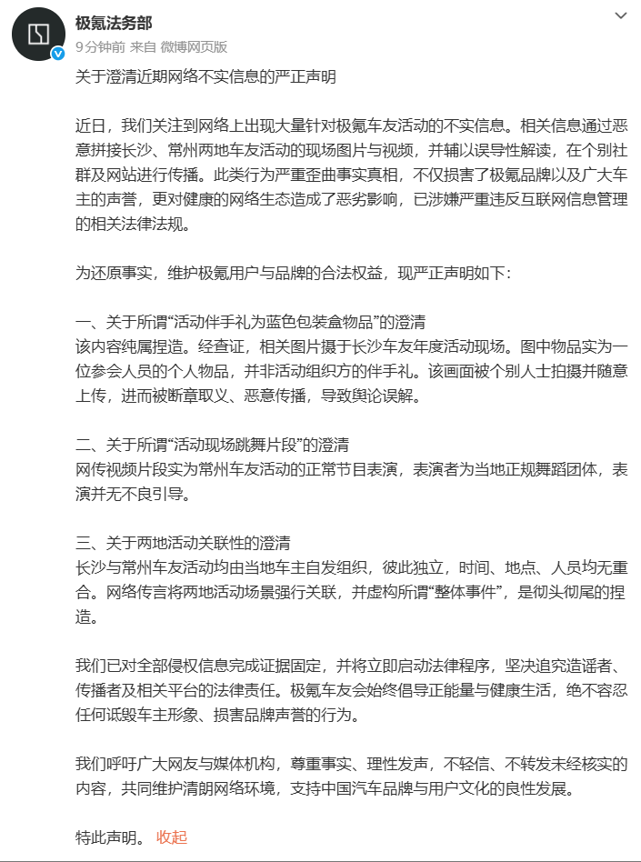 对此,1月14日下午,极氪法务部在微博发布《关于澄清近期网络不实信息的严正声明》,称近日关注到网络上出现大量针对极氪车友活动的不实信息。相关信息通过恶意拼接长沙、常州两地车友活动的现场图片与视频,并辅以误导性解读,在个别社群及网站进行传播。此类行为严重歪曲事实真相,不仅损害了极氪品牌以及广大车主的声誉,更对健康的网络生态造成了恶劣影响,已涉嫌严重违反互联网信息管理的相关法律法规。