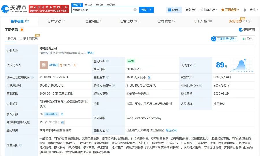 天眼查工商信息显示,鸭鸭羽绒服关联公司鸭鸭股份公司成立于2000年5月,法定代表人为樊继波,注册资本1.05亿人民币,经营范围包括羽毛(绒)及制品制造、家居用品制造、家用纺织制成品制造等。