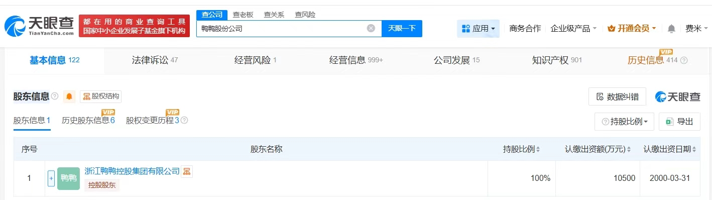 股东信息显示,该公司由浙江鸭鸭控股集团有限公司全资持股。