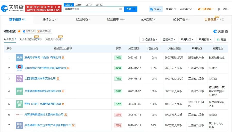 对外投资信息显示,该公司对外投资7家企业,其中5家处于存续状态,包括宸虎电子商务(杭州)有限公司、江西维雅服饰有限责任公司、共青城市鸭鸭网络科技有限公司等。