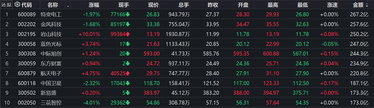 个股方面,特变电工267.2亿元成交额居首,金风科技、岩山科技、蓝色光标、中际旭创等成交额靠前。