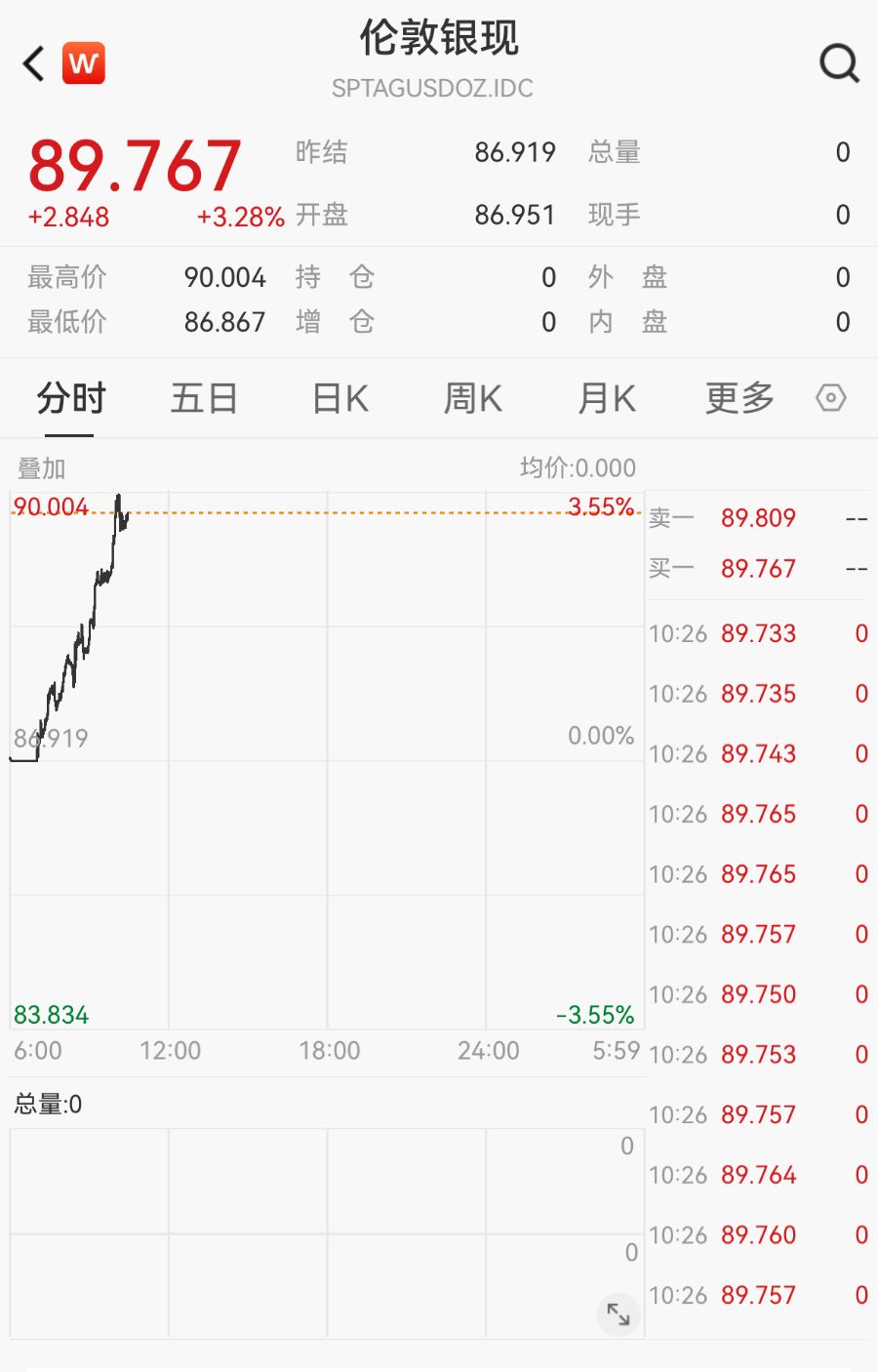 1月14日周三,现货白银开盘强势拉升,盘中一度涨3.55%,首次站上90美元关口,再创历史新高。