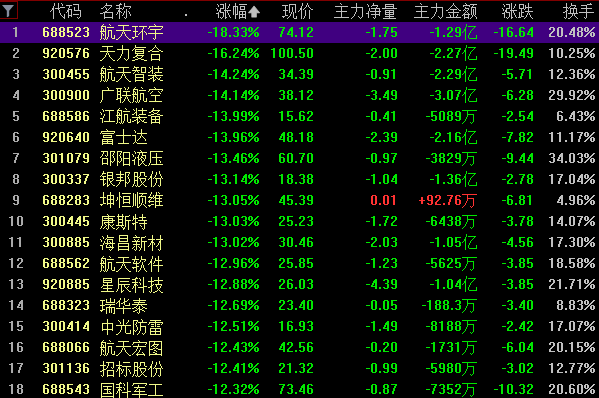 商业航天板块大面积退潮,航天环宇、航发科技、中天火箭等多股跌停或跌超10%。