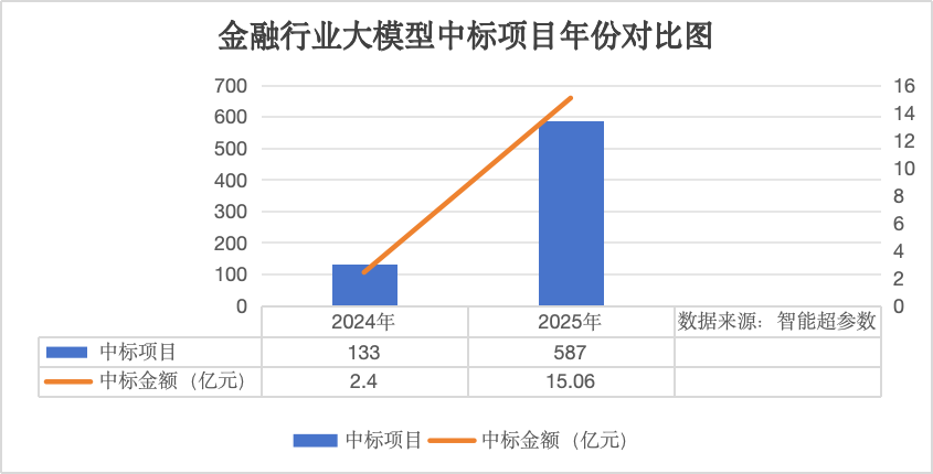 据长期关注大模型市场中标情况的“智能超参数”数据,2025年金融行业大模型中标项目达587个,披露金额15.06亿元,较2024年的133个项目、2.4亿元实现跨越式增长。
