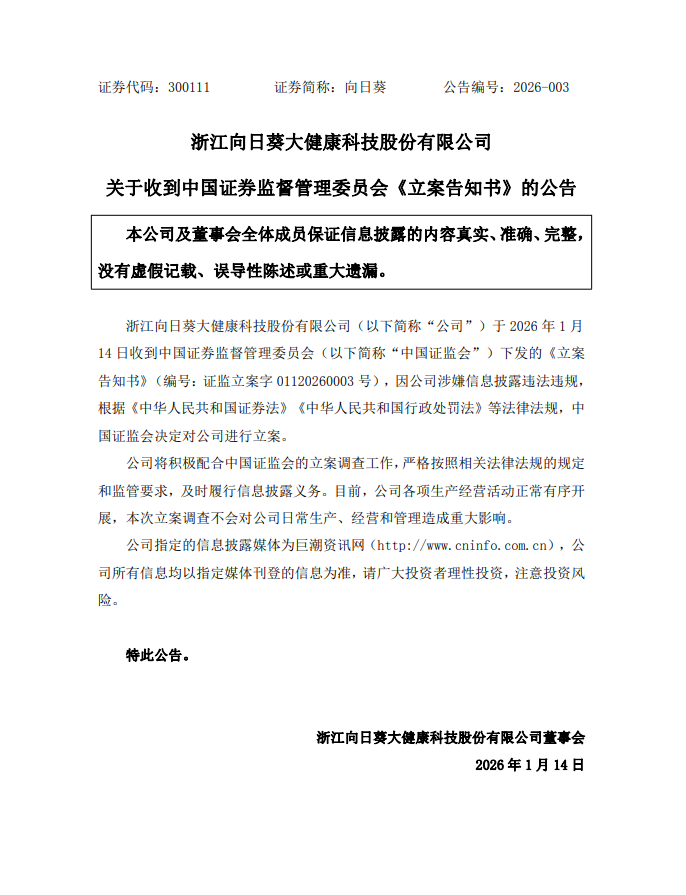2026年1月14日晚,浙江证监局发布通报:浙江向日葵大健康科技股份有限公司(简称“向日葵”,股票代码:300111)因在2025年9月22日披露的《重大资产重组预案》中涉嫌存在误导性陈述,已依法对其立案调查。此举标志着市场对该公司跨界收购半导体材料企业漳州兮璞材料科技有限公司(简称“兮璞材料”)的质疑,正式进入监管执法程序。