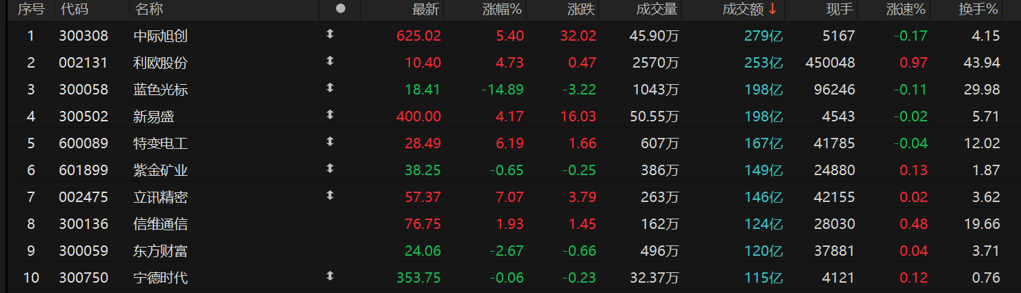 个股方面,中际旭创成交额279亿元居首,利欧股份、蓝色光标、新易盛、特变电工等成交额靠前。