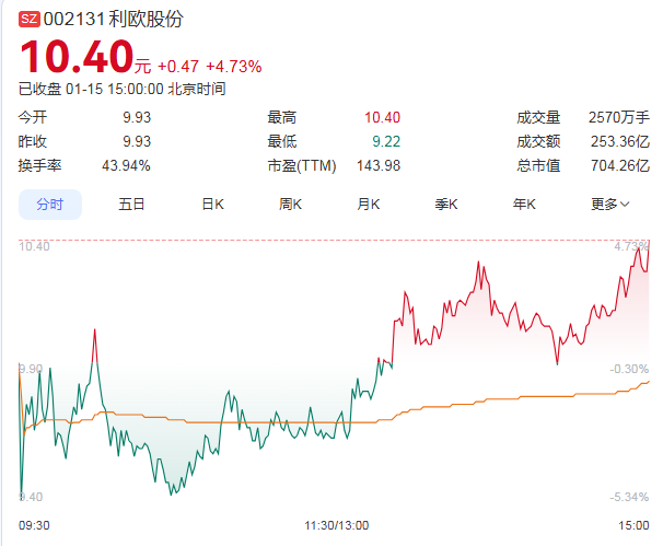 1月15日,利欧股份强势上涨,收盘价为10.40元,成交额为253.36亿元,总市值攀升至704.26亿元。据统计,自2025年12月31日以来的短短10个交易日内,利欧股份股价累计涨幅超过102%,表现非常不错。