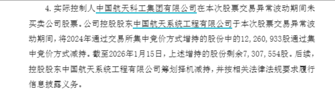 1月15日晚,商业航天大牛股航天发展发布股票交易异常波动公告,公司股票连续三个交易日收盘价格跌幅偏离值累计超过20%。公司控股股东中国航天系统工程有限公司于此次股票交易异常波动期间,将2024年通过交易所集中竞价方式增持的股份中的1226.09万股通过集中竞价方式减持。截至2026年1月15日,上述增持的股份剩余730.76万股。后续,控股股东中国航天系统工程有限公司筹划择机减持。