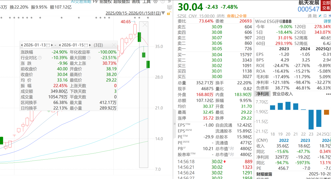 二级市场上, A股商业航天板块近日连续回调,截至1月15日,Wind商业航天指数近3日回撤近4%, 航天发展1月15日盘中跌停,近3个交易日来股价重挫近25%,市值跌至480亿,航天发展自2025年9月29日低点迄今股价累计最大涨幅达452%。