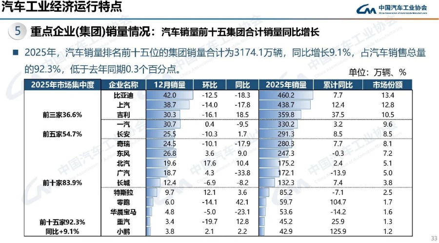 根据中汽协统计的榜单,比亚迪、上汽、吉利揽获2025年新车销量前三,三家市场份额达到36.6%。销量前15名的汽车公司或集团销量合计为3174.1万辆,同比增长9.1%,已经占据中国车市销量的92.3%。
