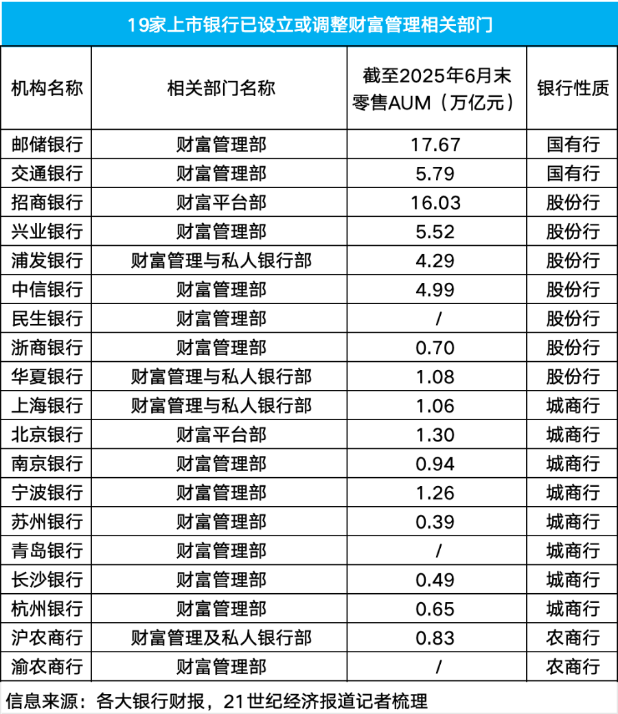 事实上,据本报记者不完全统计,已有19家上市银行设立或调整了财富管理相关业务部门,涵盖2家国有大行、7家股份制银行、8家城商行及2家农商行。