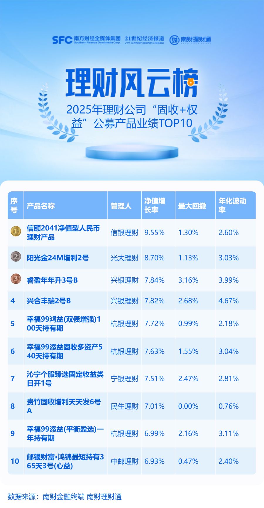 上榜的10只产品2025年净值增长率均在5%以上,其中排名前两名的信银理财“信颐2041”和光大理财“阳光金24M增利2号”2025年净值增长率均超过8%,同时产品最大回撤均不超过2%。兴银理财“睿盈年年升3号B”排名第三位,2025年净值增长率为7.84%,但最大回撤在上榜产品中相对较高。